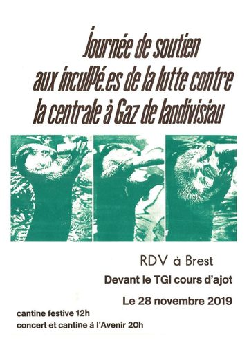 Devant la justice qui individualise, nous vous appelons à venir marquer votre solidarité avec nous, devant et à l'intérieur du tribunal. Si nous ne sommes que quelques personnes poursuivies, c'est plus largement l'ensemble d'une lutte populaire qui est attaquée. Les inculpés et inculpées du 4 juillet, toujours en lutte contre la centrale, et son monde. Rdv vers midi devant le TGI de Brest. Une soirée de soutien aura également lieu à l'avenir en début de soirée. »