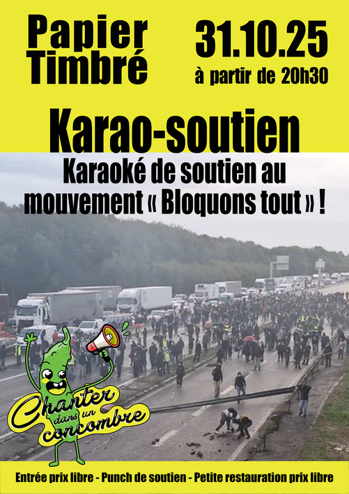 Les concombres 🥒 reprennent du service le vendredi 31 octobre au Papier Timbré pour un karaoké spécial soutien au mouvement "Bloquons tout" ✊!