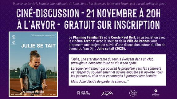 Dans le cadre de la journée internationale de lutte contre les violences faites aux femmes et aux minorités de genre, le Planning Familial 35 en partenariat avec le Cercle Paul Bert et la mairie de Rennes vous propose la projection gratuite du film "Julie se tait".