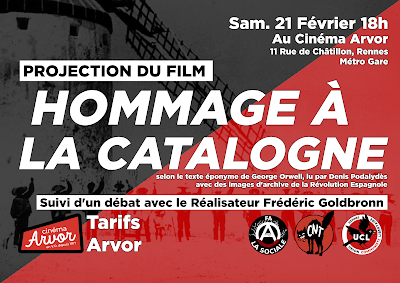 Le samedi 21 Février à 18h, les organisations Fédération Anarchiste - FA groupe La sociale; Union Communiste Libertaire UCL et Confédération Nationale du Travail CNT 35 organisent au cinéma "L'Arvor" 11 rue de Châtillon à Rennes (M° Gare)