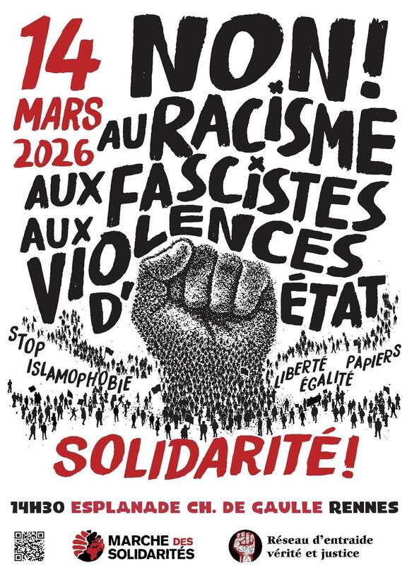 On ne peut pas laisser le racisme et le fascisme s'installer au sein de nos mairies, alors que le premier tour des municipales approche, il est temps de se faire entendre. Des rassemblements sont organisés dans toute la France, et plus précisément à Rennes ce samedi 14 mars, le rendez-vous est à 14h30 place de la République. Soyons nombreux·ses pour porter nos valeurs de solidarité et dire non aux violences d'état et aux idées de haine, faites circuler l'info.