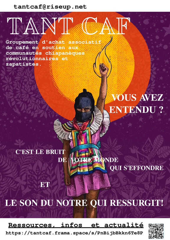 Aussi, à cette occasion, après une veille de plusieurs mois, Tantcaf refait joliment surface ! Nous proposerons une distribution de café, un info-kiosque et quelques sweats et tee shirt à prix libre. La totalité des fonds, hors défraiement, est reversé aux communautés zapatistes, et les bénéfices sont destinés à financer un bloc chirurgie dans la foret Lacandone et un espace de soin dédié aux femmes.