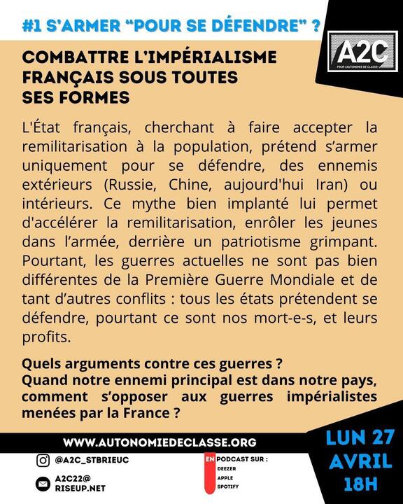 L'État français, cherchant à faire accepter la remilitarisation à la population, prétend s'armer uniquement pour se défendre, des ennemis extérieurs (Russie, Chine, aujourd'hui Iran) ou intérieurs. Ce mythe bien implanté lui permet d'accélérer la remilitarisation, enrôler les jeunes dans l'armée, derrière un patriotisme grimpant. Pourtant, les guerres actuelles ne sont pas bien différentes de la Première Guerre Mondiale et de tant d'autres conflits : tous les états prétendent se défendre, pourtant ce sont nos mort-e-s, et leurs profits.